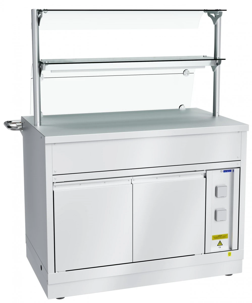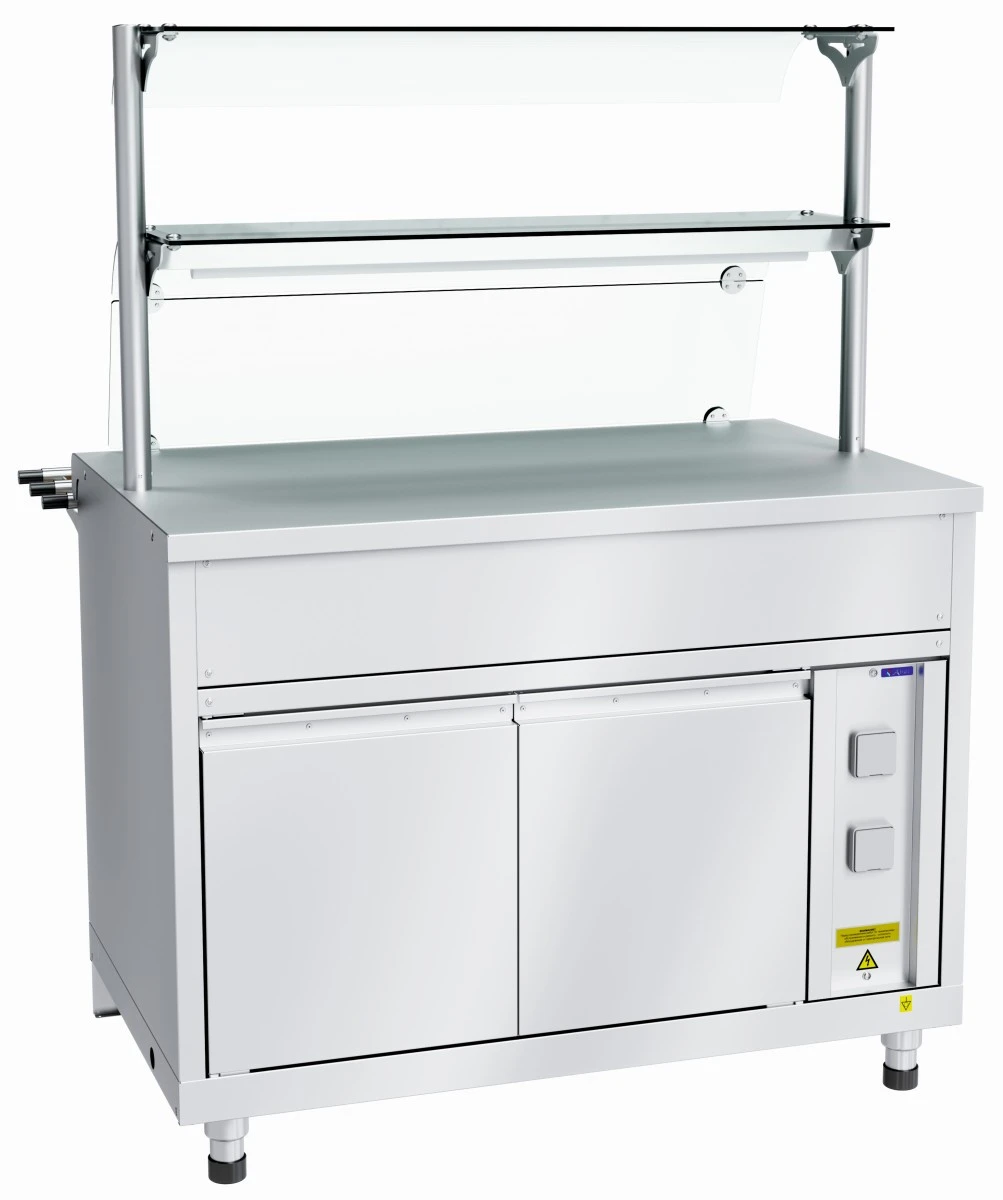 Габаритные размеры: 1120х1016х1487мм, напряжение 220В, 2 розетки на 16 А Прилавок для горячих напитков предназначен для кратковременного хранения и раздачи потребителю хлебобулочных и кондитерских изделий, а также для установки на его столе термостата и кипятильника. - направляющие без стыков - супы и напитки не прольются во время движения подноса (идут в комплекте) - цоколь по нижнему краю закрывает просвет от пола до корпуса элементов - пыль не скапливается под изделиями - внизу нейтральный шкаф для хранения кухонного инвентаря - регулируемые по высоте ножки.