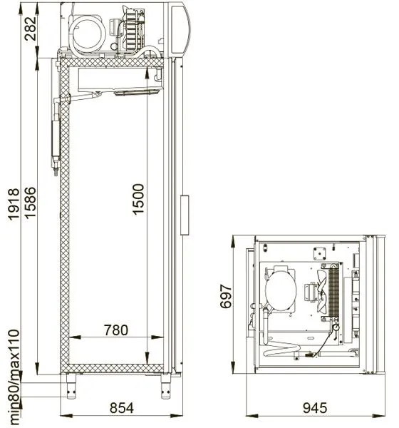 Шкаф холодильный среднетемпературный DM107-S (ШХ-0,7 ДС) Габариты: 697х945х1960мм, в упаковке: 800х1000х2125мм Вес: нетто- 122кг, брутто- 146кг Тем. режим: +1...+10С, Мощность: 400Вт, Напряжение: 230В Объем номинальный: 700л, Размер полки: 530х650мм 4(шт) Гарантия: 12 месяцев