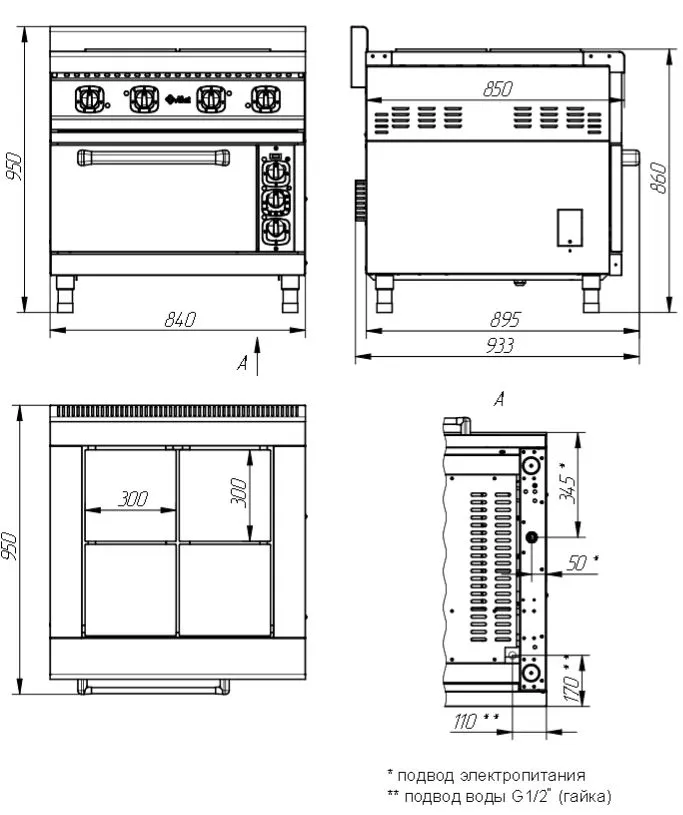 Габариты: 840х950х950 мм, 17240Вт, 380В, +20...+270 C, 4 конфорки, КЭТ-0,09, духовка GN 2/1, конвекция, пароувлажнение, вся нерж.