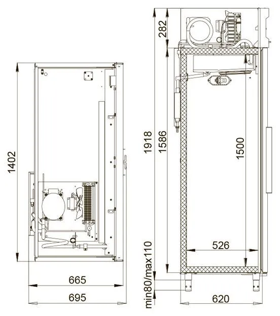Шкаф холодильный CM110-S (ШХ-1,0), габаритные размеры: 1402х695х1960мм Вес нетто 155кг, Мощность 550Вт, напряжение 230В. номинальный объем 1000л, рабочий объем 750л.