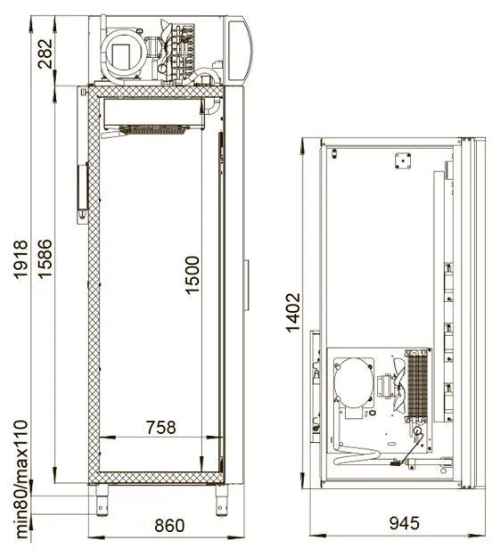 Шкаф холодильный среднетемпературный DM114Sd-S (ШХ-1,4 ДС) Габариты: 1402х945х1960мм, в упаковке: 1500х1000х2125мм Вес: нетто- 205кг, брутто- 234кг Тем. режим: +1...+10С, Мощность: 600Вт, Напряжение: 230В Объем номинальный: 1400л, Размер полки: 530х650мм 8(шт) Гарантия: 12 месяцев