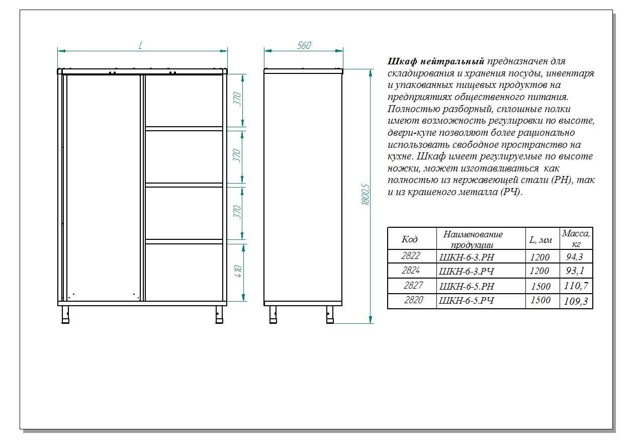 Габариты: 1200х560х1800 мм. Материал корпуса - нержавеющая сталь. Допустимая нагрузка на полку 50 кг. Допустимая нагрузка 200 кг. Вес (без упаковки) 100 кг.