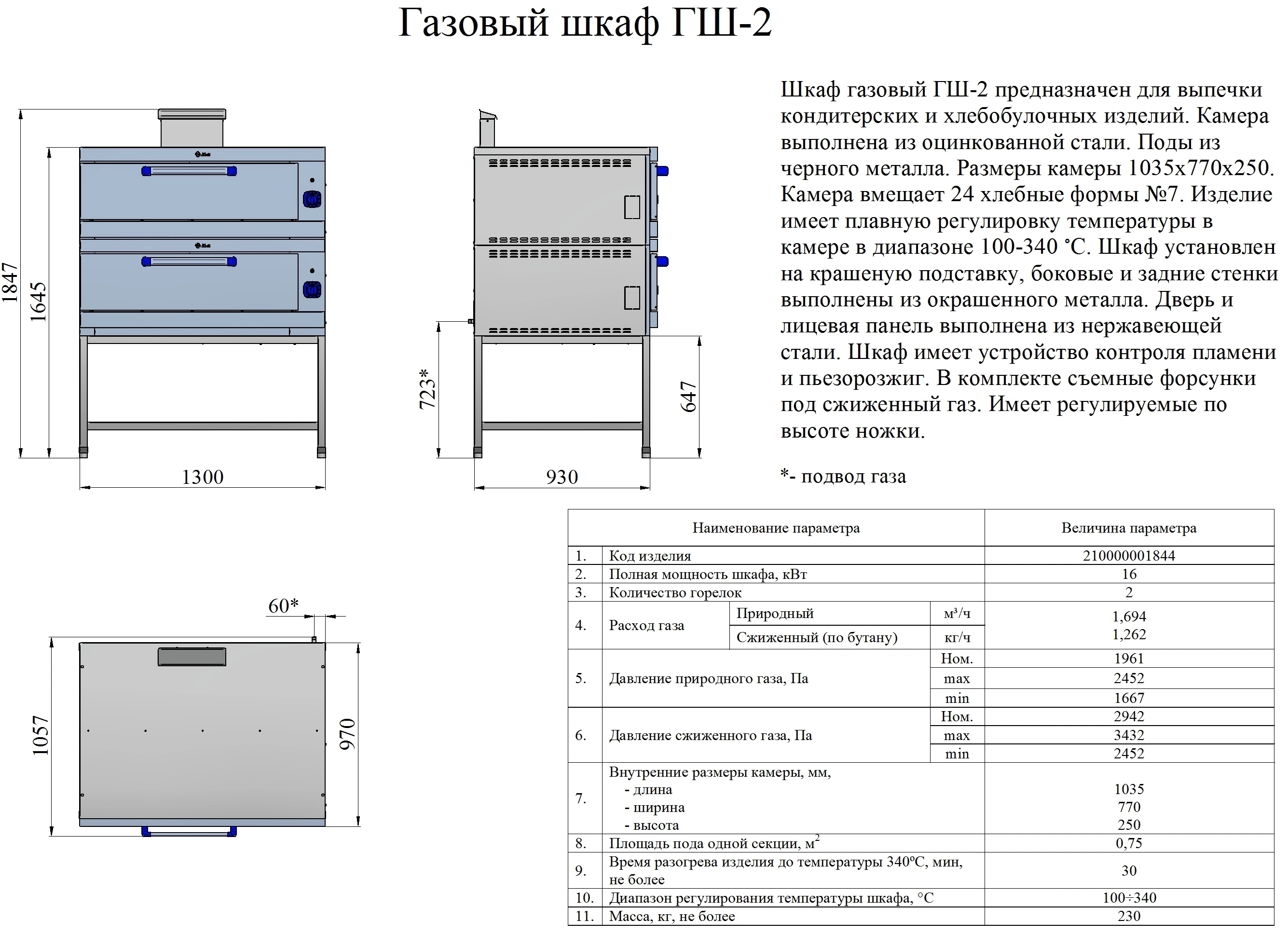 Габариты: 1300х970(1057)х(1488)1690 мм, 16000Вт, 2 пекарные камеры 1035х770х250 мм, +100...+340 С, пьезорозжиг, газ-контроль, нерж. облицовка, нерж. дверца, краш. боковые и задняя стенки, поды - углеродистая сталь, 2 горелки, краш. подставка