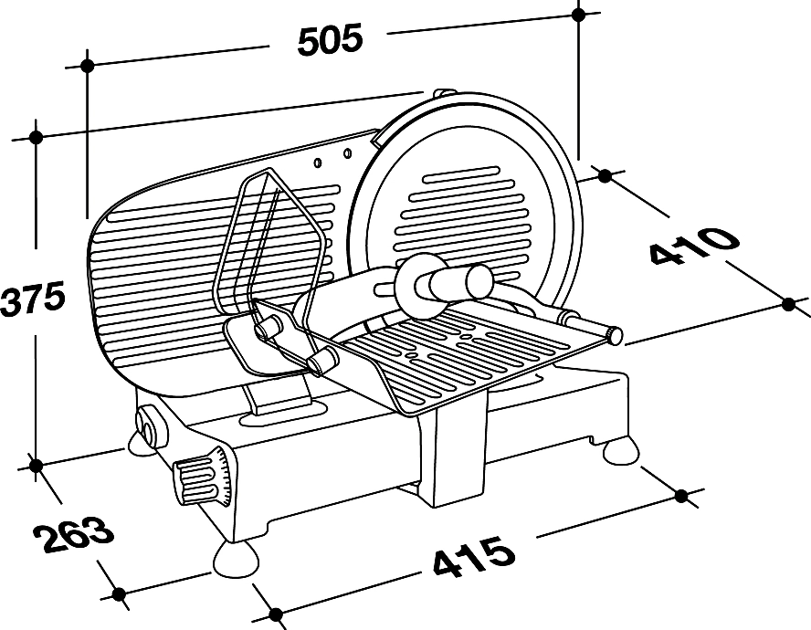 Производительность 27кг/ч, габариты 520х450х390, мощность 150Вт, напряжение 220В. Слайсер предназначен для профессиональной нарезки различных продуктов (колбасных изделий, сыра, хлеба) с помощью лезвия из хромированной стали. Корпус изготовлен из лакированного алюминия. Слайсер оборудован вентилируемым мотором, защищающим от прибор от перегрева. Толщина нарезки 0-15 мм. Диаметр ножа – 275 мм. Максимальный размер нарезаемого продукта – 225х180 мм.
